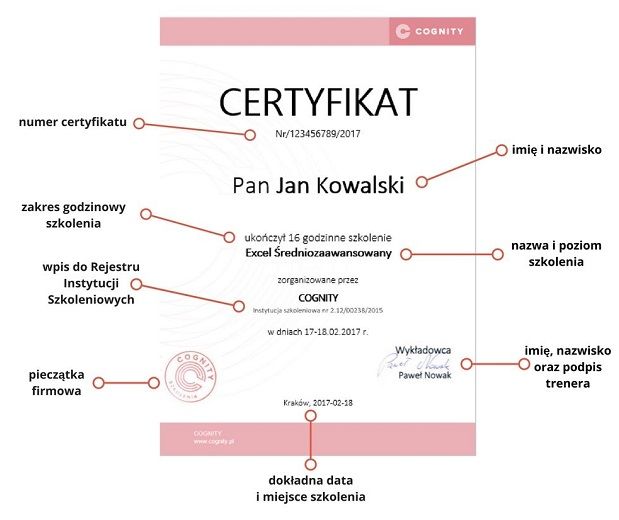 Jest to potwierdzenie, że szkolenie przeprowadzone jest przez profesjonalną firmę szkoleniową. Możemy się pochwalić, że Cognity posiada taki wpis. Znajdziecie nas pod numerem 2.12/00238/2015.